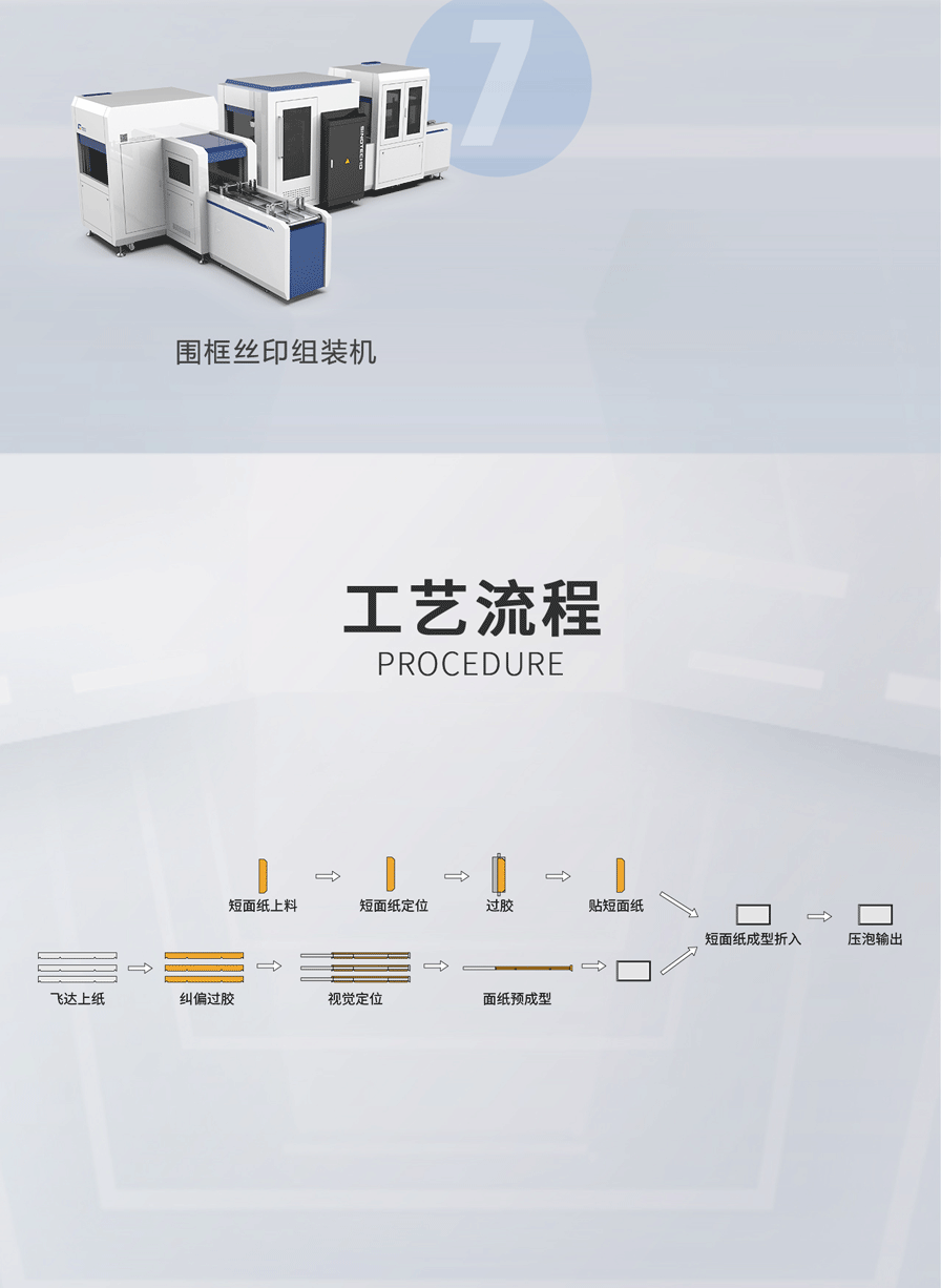該整線可實(shí)現(xiàn)長(zhǎng)面紙過(guò)膠、灰板定位、圍框成型、短面紙滾膠定位,折入、刮楞/熱壓楞和壓泡等工藝。