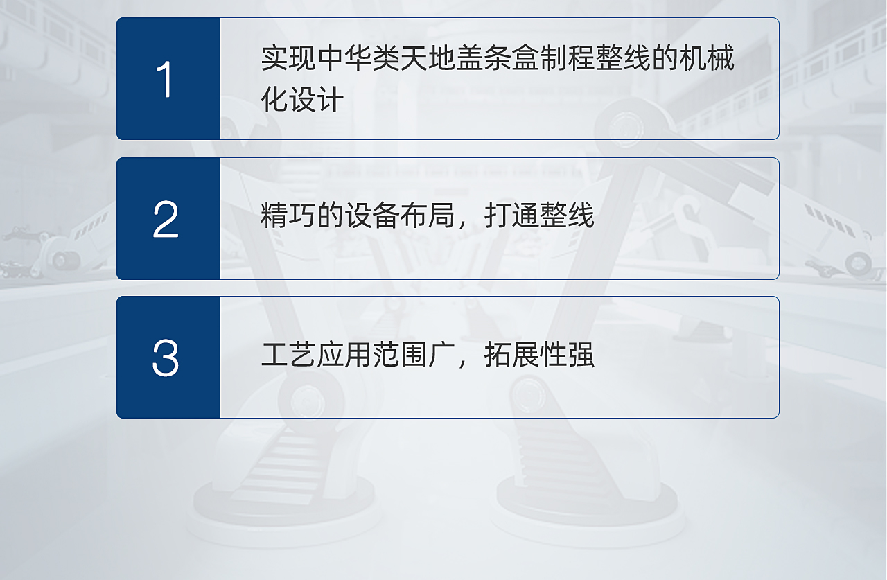 TG-CN20C智能煙包天地蓋條盒數(shù)字化整線可實(shí)現(xiàn)天地蓋糊盒成型、滾膠貼內(nèi)襯紙、貼連接條、圍條成型以及全自動(dòng)整形除泡等全套工藝。
